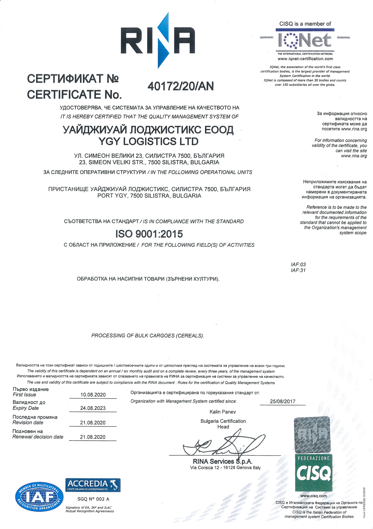 В складовата базата се осъществява строг контрол на вход и изход посредством два автокантара, оборудвани с два пробовземача, две порционни везни с капацитет 500 м3, а контрола на качеството на зърното от момента на получаване до момента на експедицията става в съвременна лаборатория с лабораторни уреди за пълен анализ на зърнени и маслодайни култури. Контролът на състоянието на зърното при съхранение се заключава в извършване на периодични наблюдения и монтирана във всеки силоз автоматизирана система за термоконтрол.
