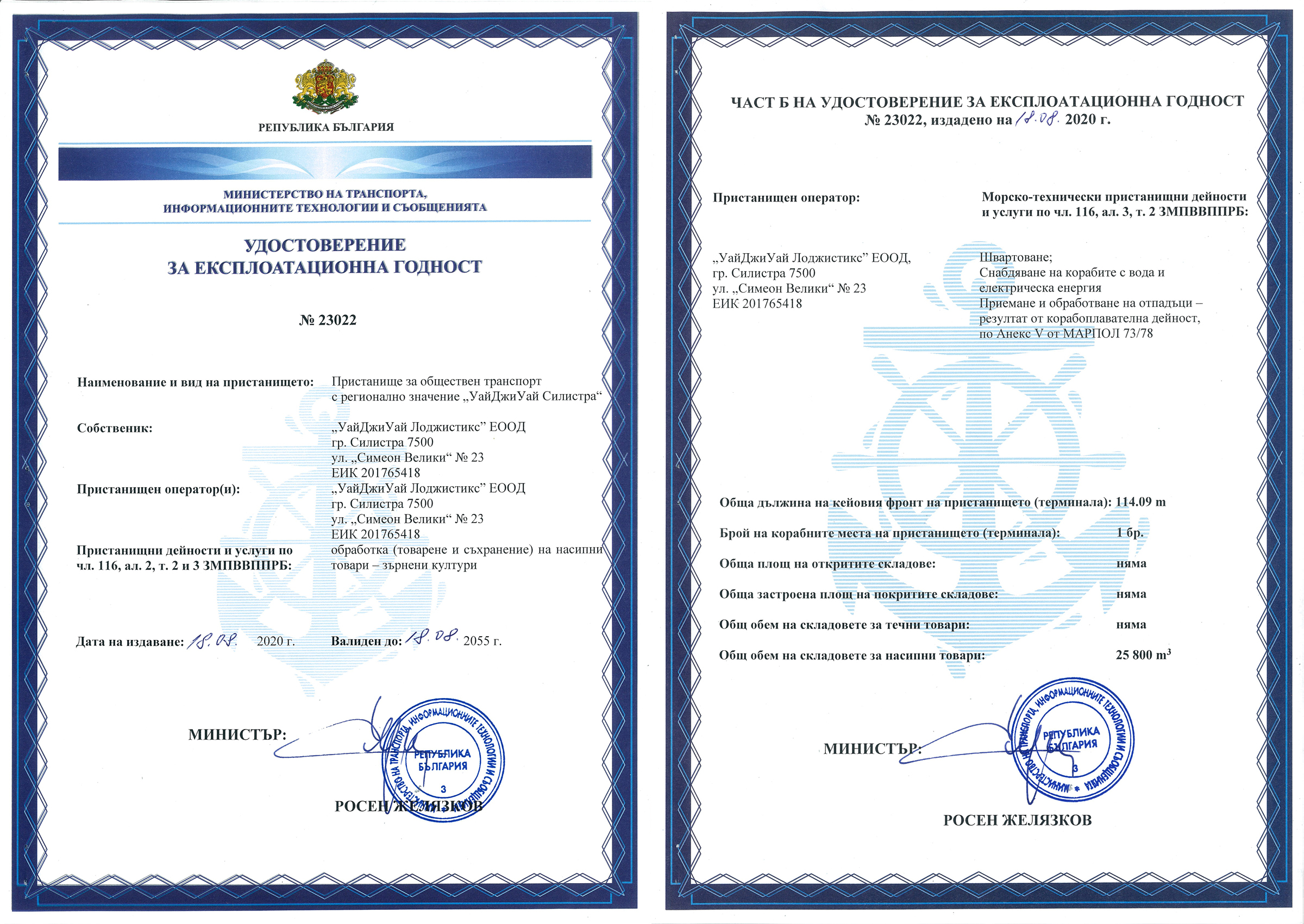 Товаро-разтоварните дейности се осъществяват от портален хидравличен кран Sennebogen 885 G, произведен и закупен през 2023 г., с товароподемност 38,3 т, снабден с два броя грайфери с големина 8 м3 и 12 м3, кука за генерални товари и претоварни греди за палетни товари, 2 бр. мобилни бункера, два стационарни лентови транспортьора, два броя порционни везни, мобилно коработоварно съоръжение с обща дължина на стрелата 38 260 мм.